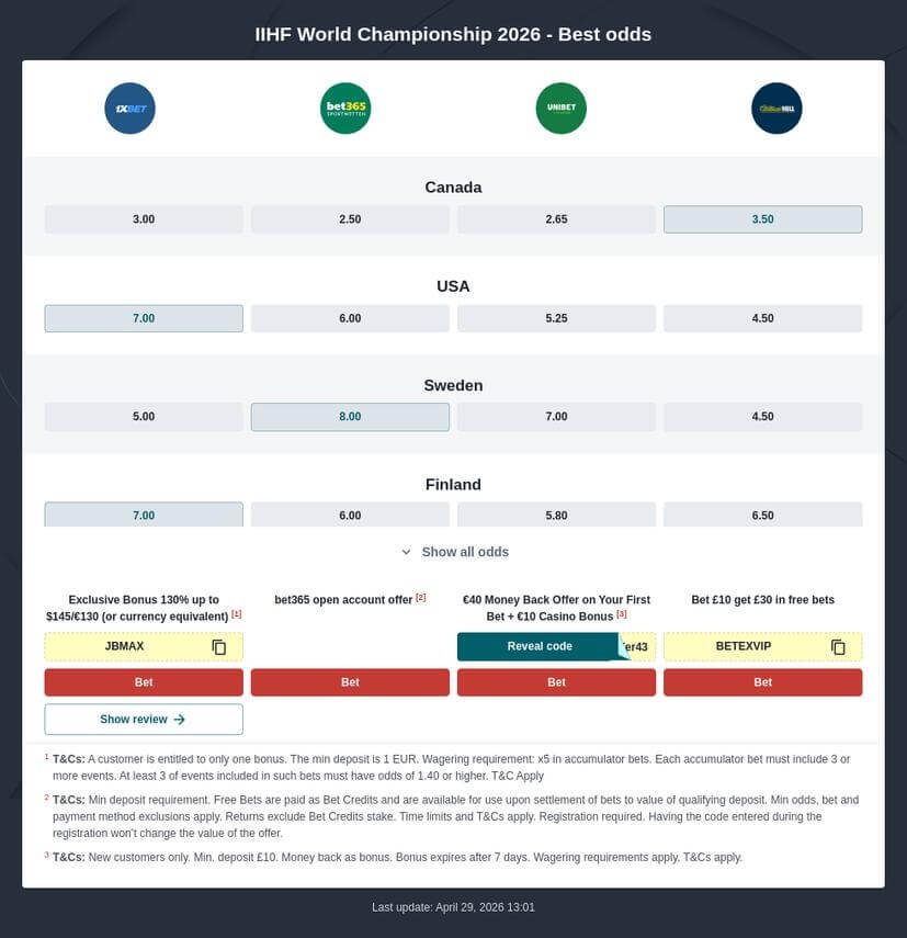 You will find a full selection of IIHF World Championship 2026 betting lines at bet365, 1XBET, Betano, BetWinner, and Roobet. You can compare the IIHF World Championship betting odds table from each of the five sportsbooks before having a wager on the tournament.