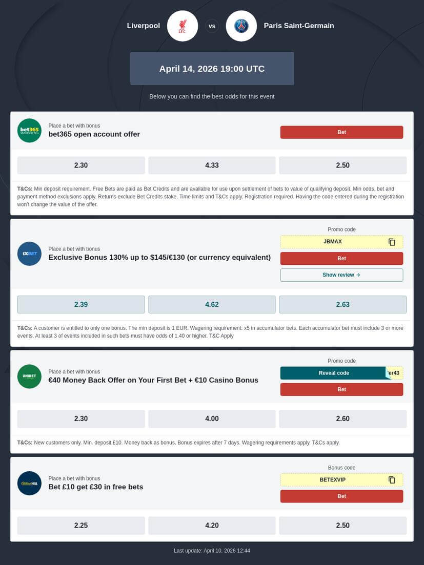 It pays to place your Liverpool v PSG predictions today with a top bookmaker, and that is where bet365 comes in. The leading online bookmaker has competitive prices for this clash, alongside great offers like 2 Goals Ahead and Sub On Play On. It is a strong option for betting on this showdown between the current Ligue 1 and EPL champions, and if you are interested in checking the EPL 2025/2026 winner odds, then make sure to read our related article.