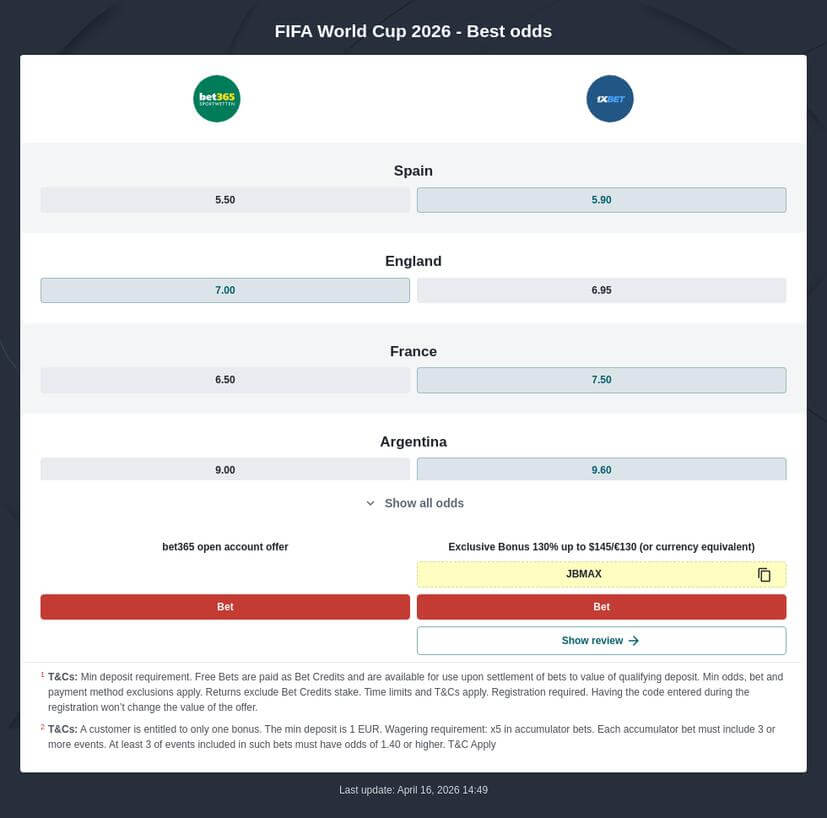 Discover the best odds and bet on your World Cup 2026 favorites with trusted bookmakers!